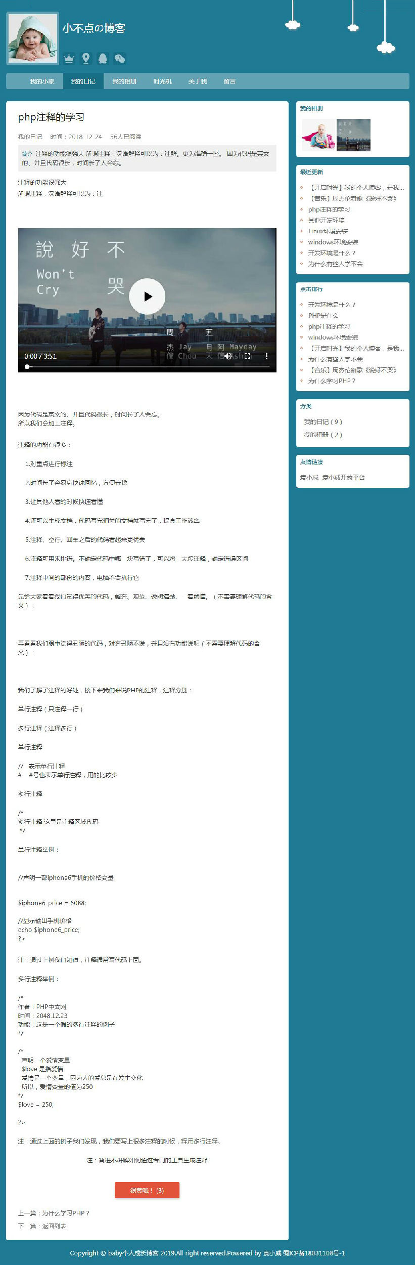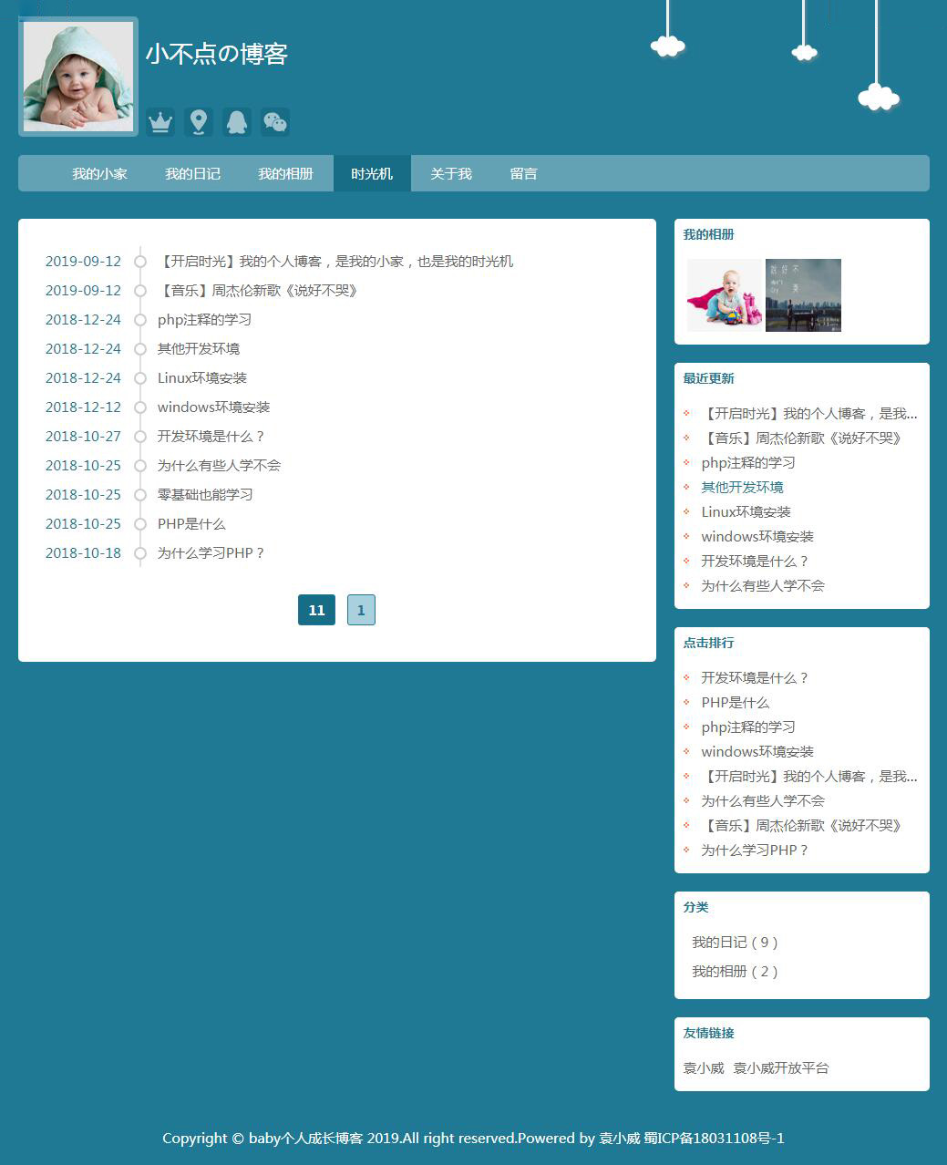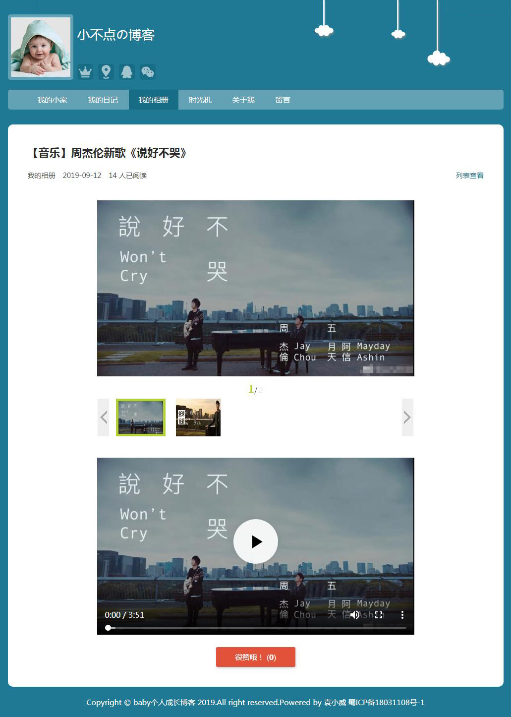 这是一个记录宝宝成长点滴的个人博客,用作于宝宝博客,亲子博客,都是适用的。颜色为蓝色调,头部有飘动的卡通云,采用css3动画效果,布局简单,代码精简,还有相册功能,发图片,视频,时间轴可记录重要时刻,也可记录宝宝的生长发育状况,也可以统计宝宝博客网站的所有文章。