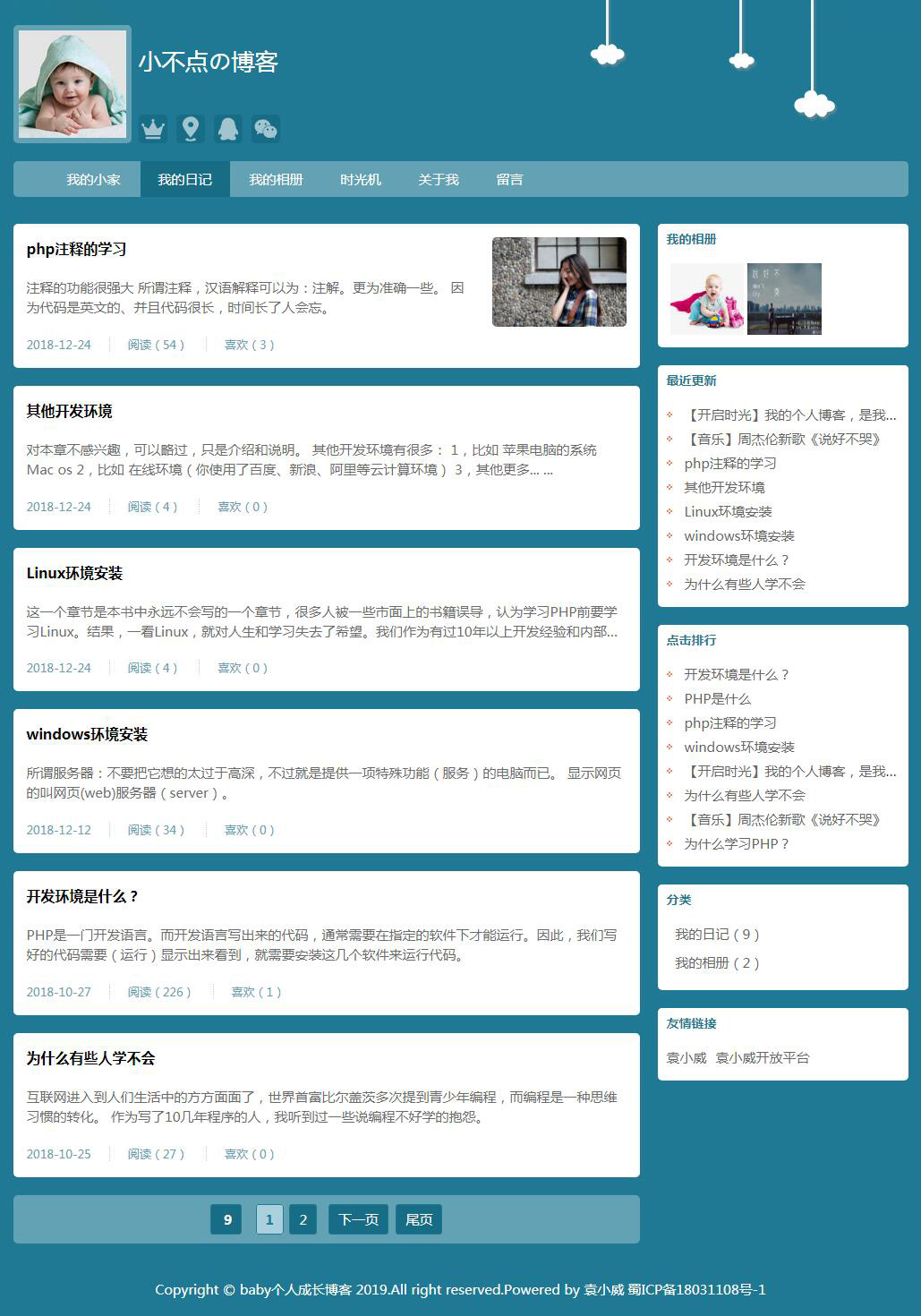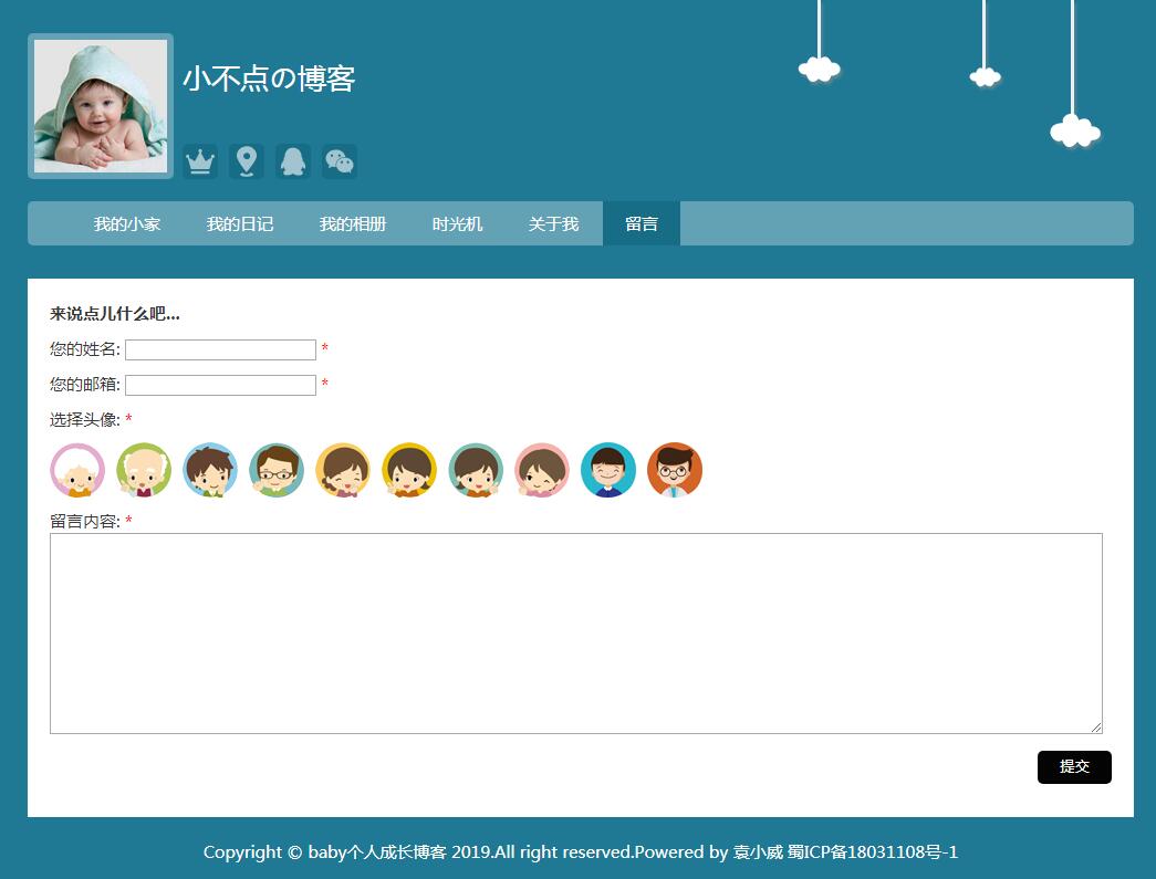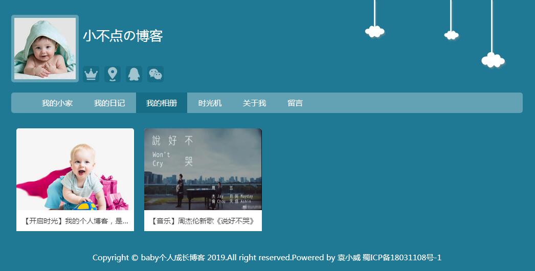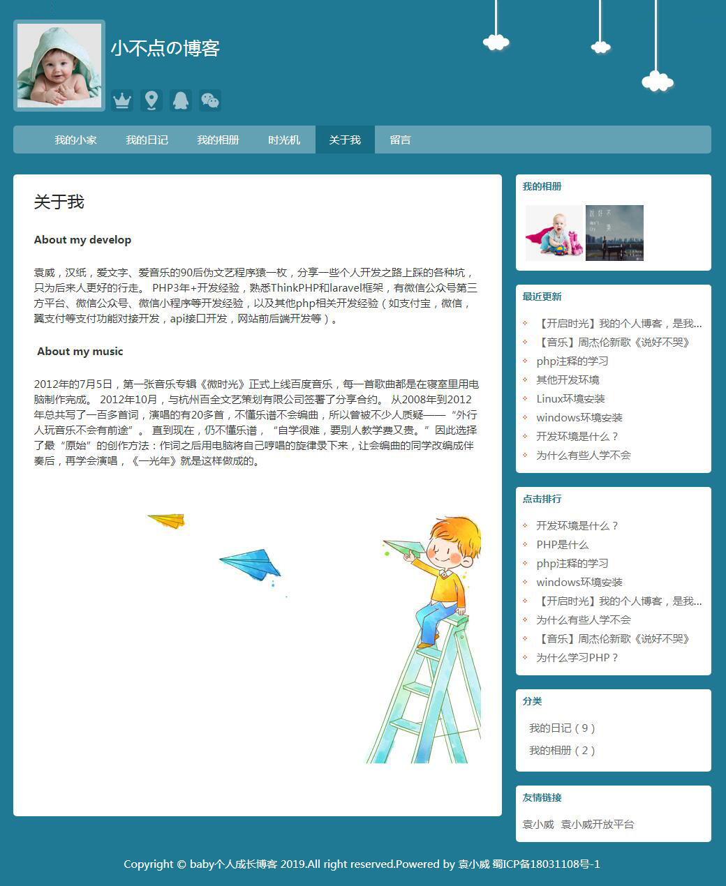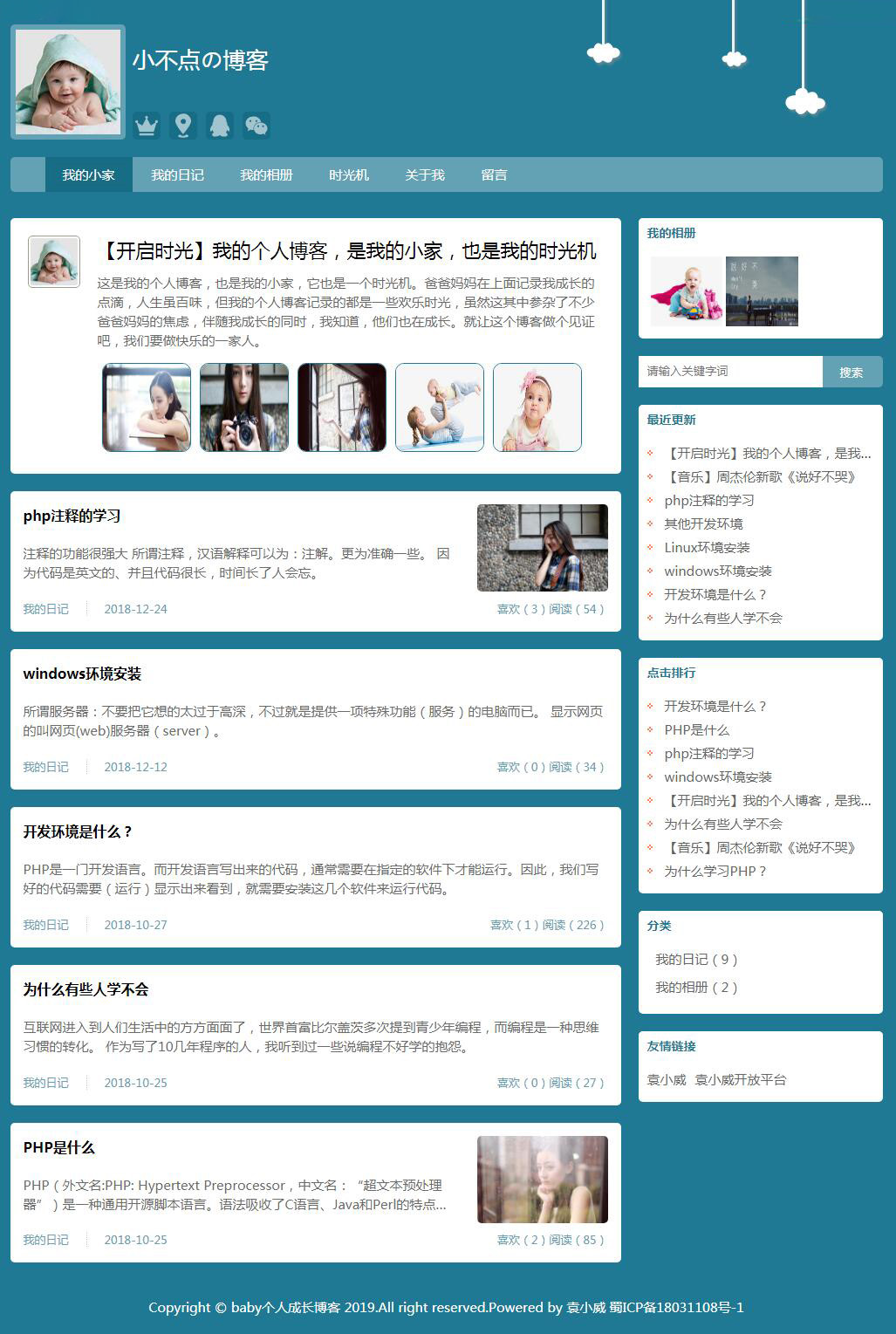 这是一个记录宝宝成长点滴的个人博客,用作于宝宝博客,亲子博客,都是适用的。颜色为蓝色调,头部有飘动的卡通云,采用css3动画效果,布局简单,代码精简,还有相册功能