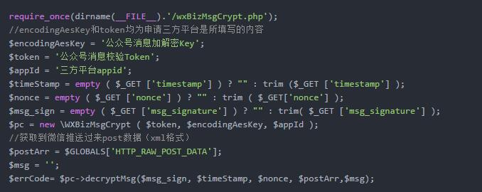 这里我们会用到微信公众号三方平台开发之component_verify_ticket篇里同样的解密方法进行数据的加解密操作,如下:
