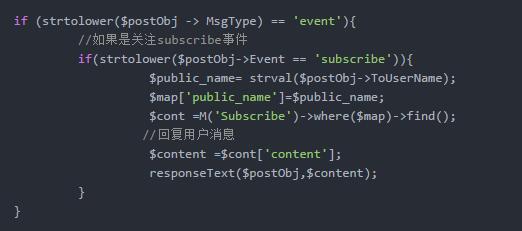 然后,根据不同的消息类型做出相应的回复,当消息类型为“event”且为用户关注事件时,微信公众号给用户自动回复一个文本消息: