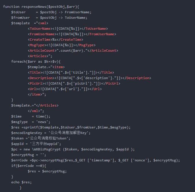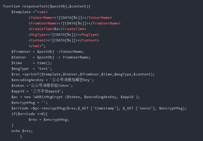 解密后,当$errCode返回值为0时,代表解密成功,下一步我们就需要对消息进行解析处理: