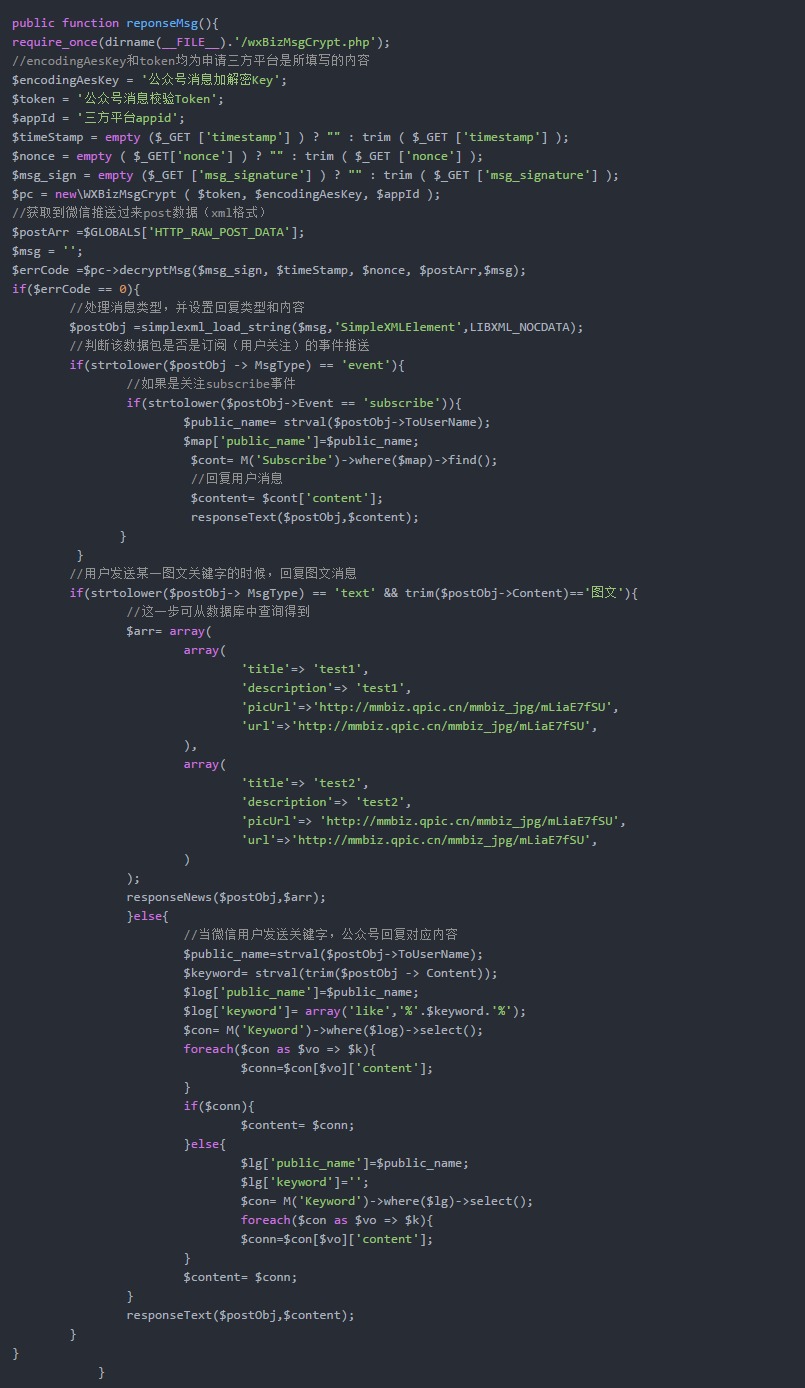 以上用到的responseText()、responseNews()鉴于代码模块化,而且方便复用,所以单独用方法写出,其他不多说了,具体见代码: