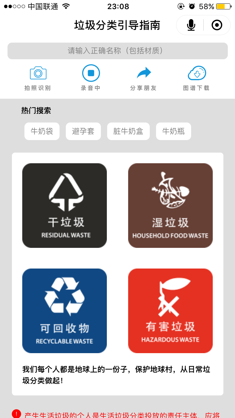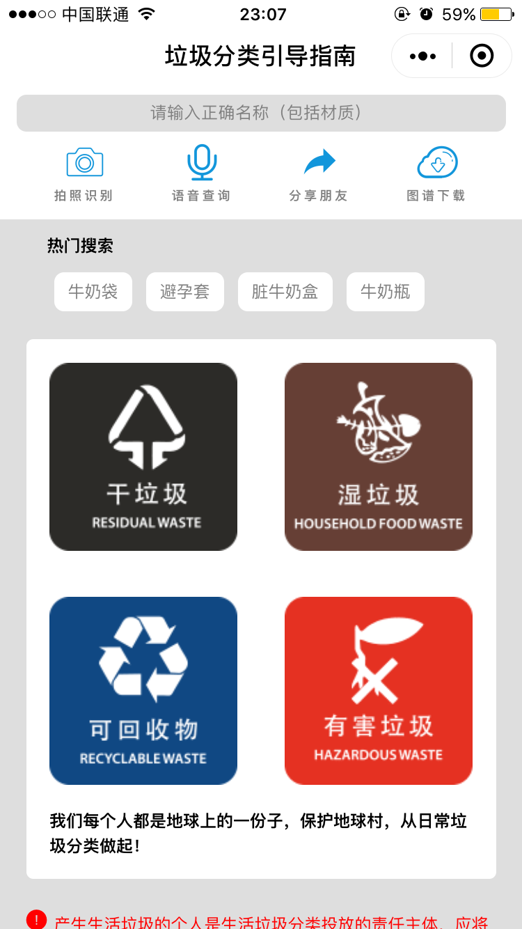 相较于前面两个版本,袁小威觉得简洁明了、好看多了。顶部搜索框为文字输入查询垃圾分类,下面一排四个图标分别为:牌照识别、语音查询、分享朋友、图谱下载,再往下就是系统目前查询比较热门的物品,再往下就是垃圾分类的四大分类了,点击不同的分类就会看到其对应的详情。