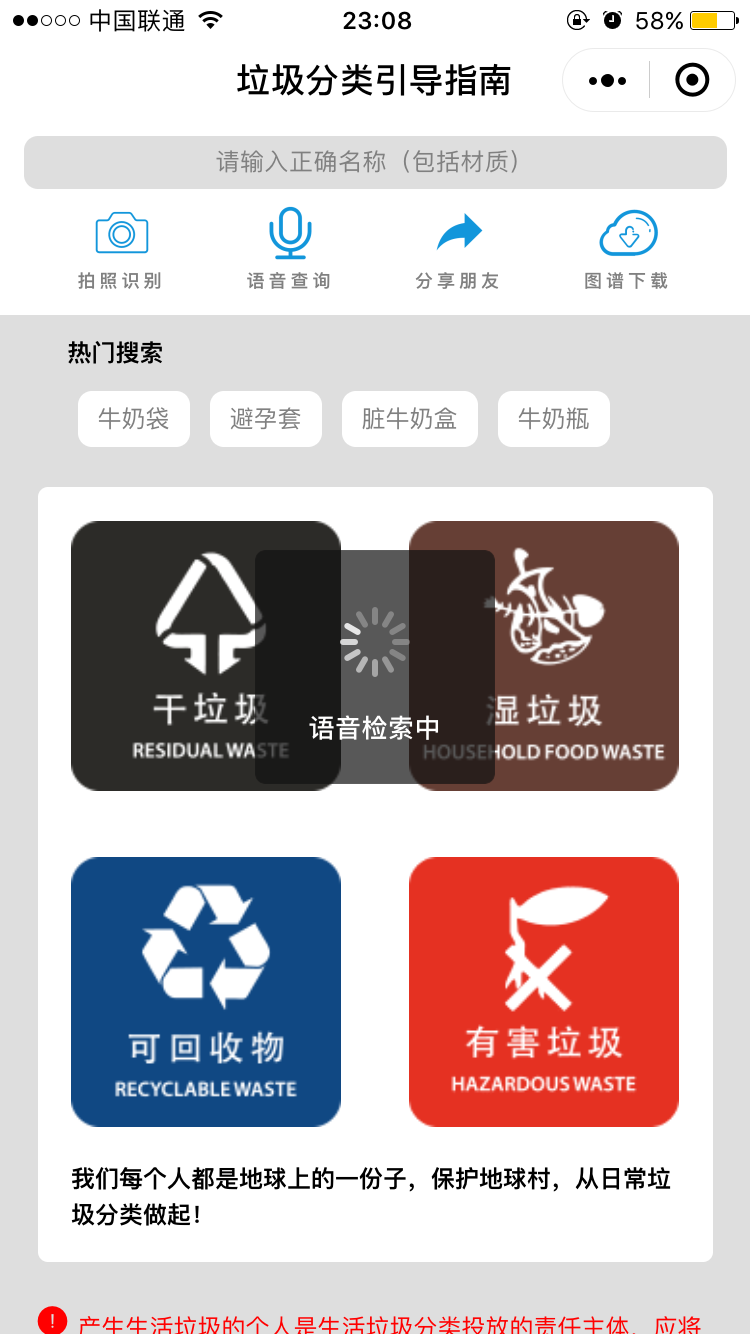 7月17日微信小程序“垃圾分类引导指南”第三个版本正式上线,历时13天,从最初的文字查询到第二版本加入图像识别查询到现今第三版加入语音识别查询功能,无论是从体质量还是体验上都得到了很大的提升(此处容我熊开心一波~)。