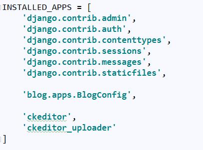 在settings.py文件中,将“ckeditor”和“ckeditor_uploader”加入到“INSTALLED_APPS”中;