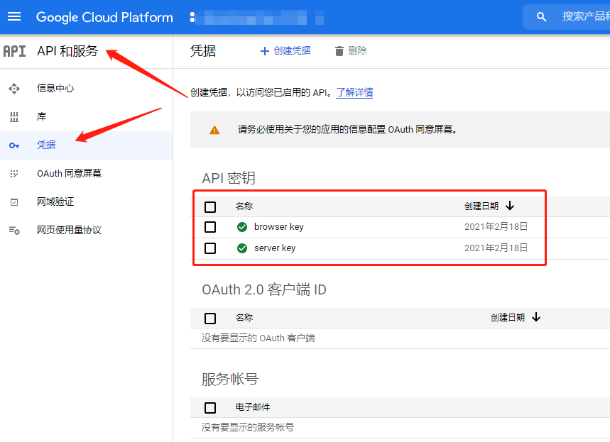 3.转到api和服务这一块,创建凭据。这些凭据就是api key,也用来限制api的具体应用范围。