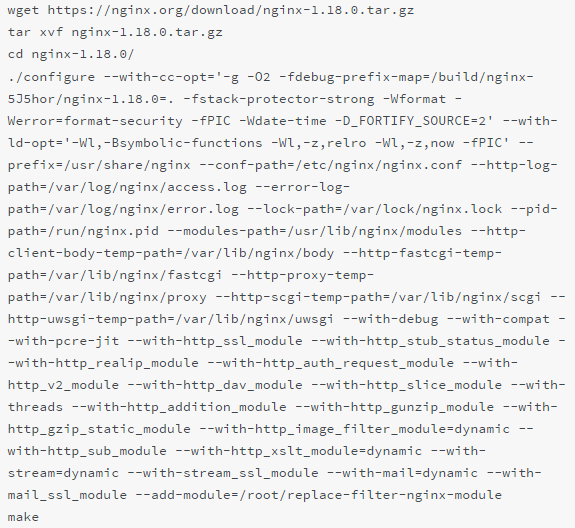 这里注意一下,--add-module=/root/replace-filter-nginx-module。需要添加进去。其它的配置选项,参考你们自己的nginx -V参数结果。