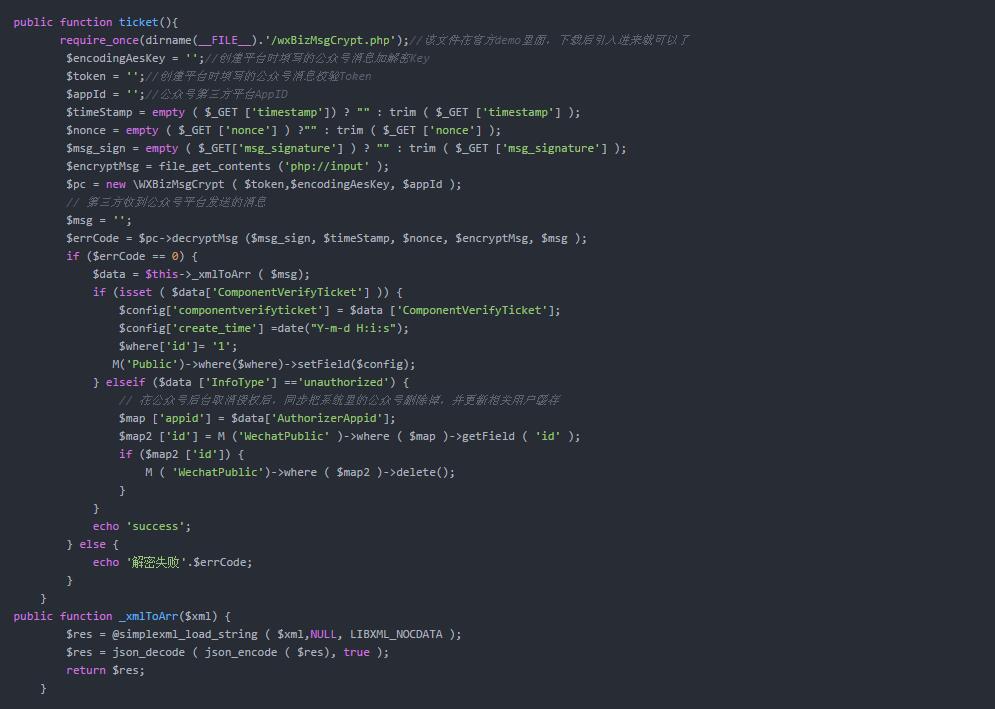 不过这部分官方有提供相应语言的解密DEMO,下面附上我自己这块的完整代码,里面用到了数据库操作以及微信公众号取消授权的操作: 这一步也是折腾我最久的地方,主要问题就是推送过来的信息是加密的我们需要先将信息解密,解密出component_verify_ticket后将该ticket保存起来。